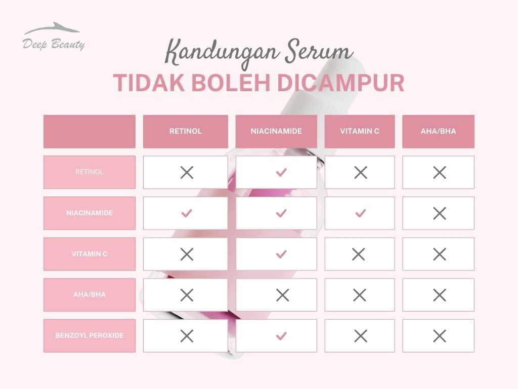 Terdapat beberapa bahan atau kandungan serum yang tidak boleh dicampur, karena dapat menyebabkan ketidakefektifan dan potensi iritasi. Meskipun interaksi spesifik bervariasi tergantung pada masing-masing bahan dan konsentrasi yang terlibat, bahan-bahan yang harus dihindari tercampur: